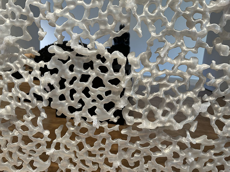 The Parallax screen (figure 3) is composed of consecutively 3D-printed plastic tiles, and each tile is of a generally radial shape and made up of identical irregular patterns. Lines and shapes are moving, curving, and melting into each other at different angles. The sections were 3D-scanned from a model that Kim created with the ceramic petals that cover other sculptures in the show.
