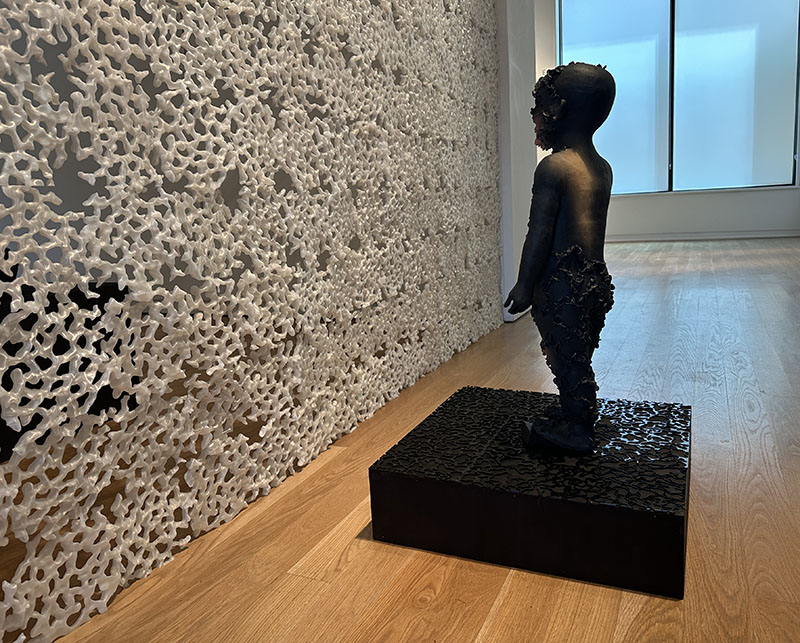 Parallax is defined as the “effect whereby the position or direction of an object appears to differ when viewed from different positions.” The effect is reimagined in Kim’s exhibition with ceramic sculptures positioned on either side of the titular piece, a white 3D-printed screen, where the viewer must look through the holes of a literal obstructive force that prohibits a clear view of the other side. As the viewer, we are the outsider perceiving the sculptures experiencing their isolated acts of grief and loss on the opposite side of the screen, figures that represent the other that we can not fully know.