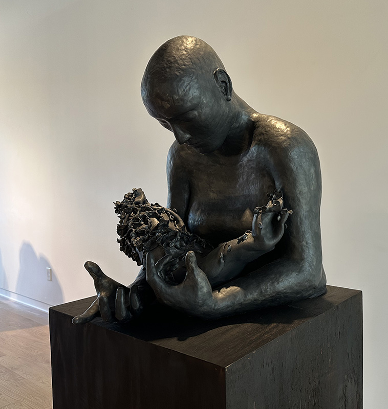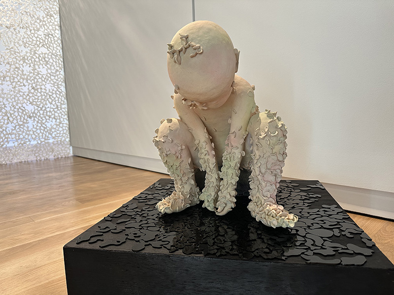 You are gone / I am not alone (figure 5) depicts a grieving parent from the torso up, holding a bundle of fabric covered in Kim’s ceramic petals. Without facial expressions and other affirmations that might provide more clarity on what the parent figure is feeling, gestures illustrate the ways in which they are grieving.
