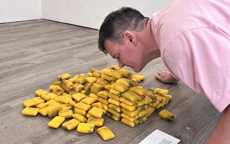 Image: Andreas Keller smelling Maddie May’s “scrub” during the “Found Scents” exhibition in 2024.