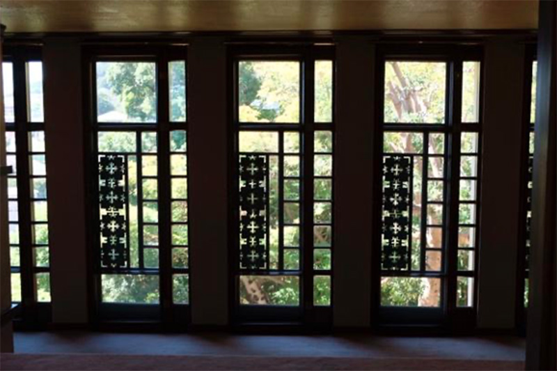 The third floor of the guest house features a Western-style corridor lined with large glass windows framed by decorative copper plates with plant motifs, allowing natural light to create dynamic interior patterns (figure 7). Unlike the other floors, which feature Western-style rooms, the third floor includes a Japanese-style tatami room, added at the request of the original owner and primarily designed by Wright’s student and assistant Endō.