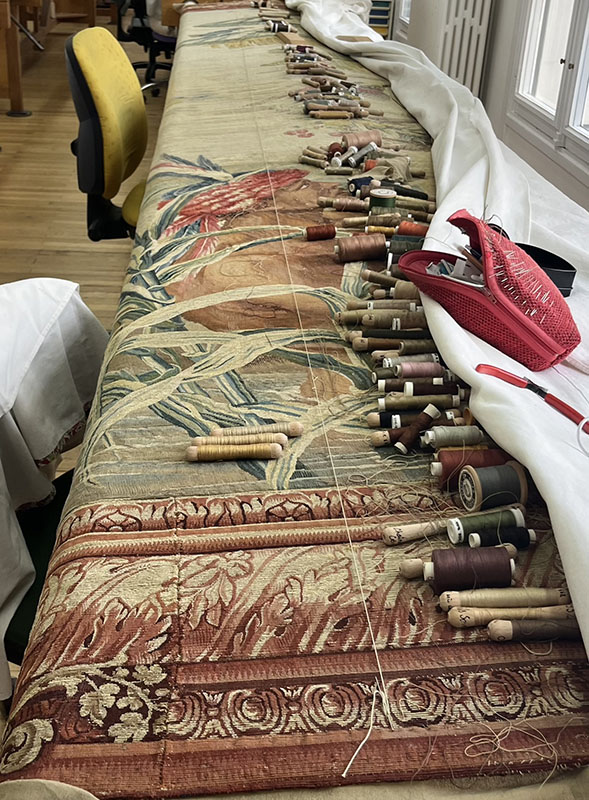With the generous support of a Decorative Arts Trust Research Grant, I traveled to Paris to conduct archival research on the Nouvelles Indes and on weaving and dying processes at the Gobelins Royal Manufactory. Although most 18th-century Gobelins archives are now held at the Archives Nationales (Maison du roi, série O1), the centre de documentation of the Mobilier National preserves several unique documents that proved crucial to my project. I also visited the conservation studio at the Mobilier National where a tapestry from the Nouvelles Indes series known as the Pêcheurs Indiens (figures 1 and 2), designed by François Desportes, and a tapestry from the set known as the Anciennes Indes known as La Reine portée, designed by Albert Eckhout, were undergoing restoration.