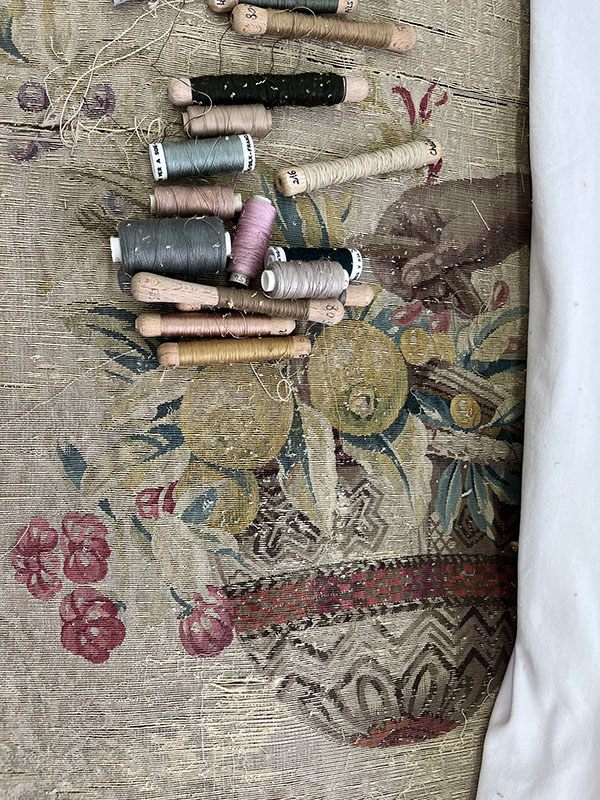 Observing the process of conservation and speaking with textile conservators sharpened my understanding of the tapestries’ original chromatic effect. This rare opportunity for sustained looking helped me learn how to distinguish silk from wool in the weft and to identify the intended visual effects produced by varying textures, weave density, and reflective qualities (figure 3). With conservators’ guidance, I was able to confirm likely zones of cochineal and indigo use and to better understand conventional material choices within Gobelins practice—for example, the tendency to use wool for the matte finish of flesh tones and to introduce silk more extensively in skies to heighten luminosity. In the literature on the Gobelins, I had not encountered information about the weavers’ strategy to distribute matte wool areas and shiny silk highlights. While scholarship of the period has traditionally assumed that artistic agency resided primarily with the painter—Jean-Baptiste Oudry, then artistic director of the Gobelins—attention to the distribution of silk and wool in the weft reveals the distinct creative choices of the weavers.