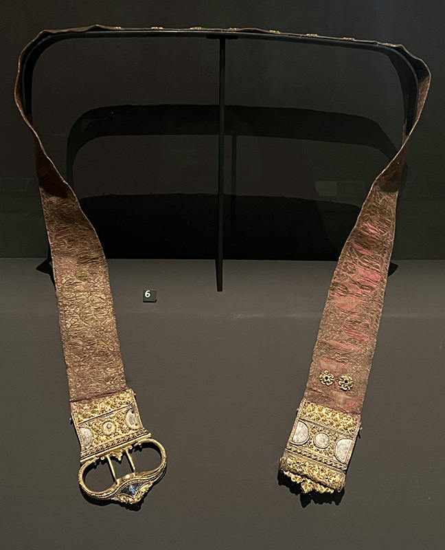 Gold-wrapped threads were also employed in secular garments and accessories. I spent time studying a 15th-century girdle (figure 2) that retains its original buckle and strap end made of gilded metal with enamel and nielloed silver details. While photographs tend to present this object laid out flat on a surface, in the gallery it was arranged over two pins to emphasize the girdle’s flexibility, and perhaps approximate how it was worn close to the body (figure 3). Displayed alongside other objects associated with love and marriage, this girdle likely belonged to a bride from a wealthy family. Silver-gilt threads were woven in a floral pattern, shimmering over a pink silk ground. Much of the gilding on the threads has worn away, revealing tarnished silver underneath. On the impressive buckle, the metalworker incorporated motifs of flowering vines, coils of rope, and interlocking chains. The complex design, with its display of different textiles and materials, attests to their artistic skill.