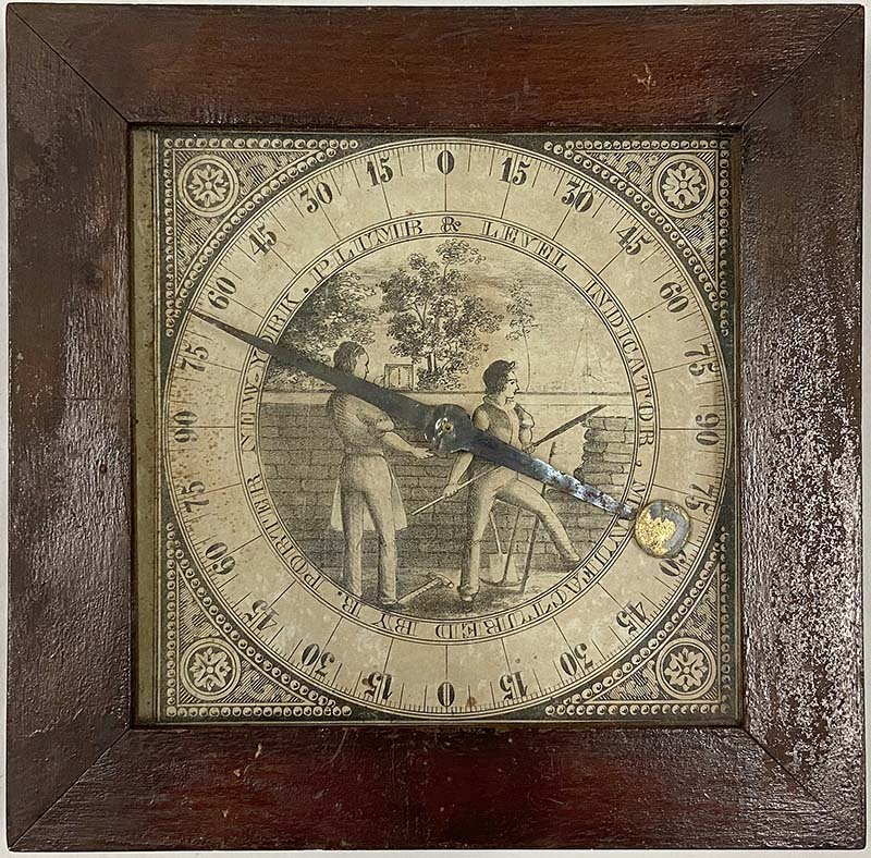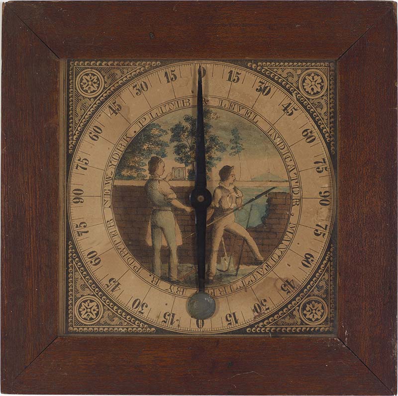 Around 1846, Porter invented a plumb and level to aid masons, bricklayers, carpenters, and millwrights. The plumb and level is roughly 9 ½ by 9 ½ inches. Surrounded by a wooden frame, the plumb and level is glazed and contains an image of two masons at work with tools in hand, standing in front of a brick wall and gazing at the scenic landscape beyond. They are looking out on the clearing, where a lush field of trees, water, and mountains can be seen. Shown sitting upon the brick wall, they are undoubtedly using the plumb and level to carry on their work. Another plumb and level (figure 4) at the Bowdoin College Museum of Art contains a colored version of the print.