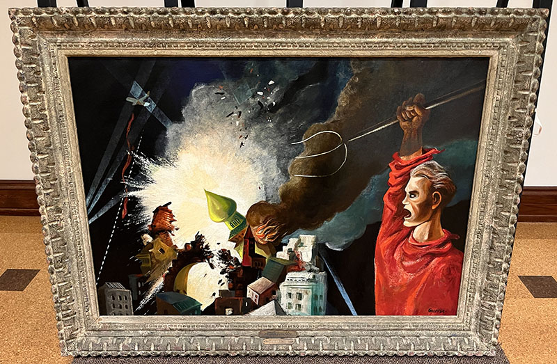 The Farnsworth Television and Radio Corporation, once based in Fort Wayne, sold radios through commissioned advertising artworks. William Gropper’s Defiance (1942–43, figure 1) at the Owsley was commissioned by advertiser N.W. Ayer for Farnsworth. Gropper depicts a proletariat fighting Axis bombers, pitchfork aloft to swipe at these nocturnal invaders. He depicts Shostakovich’s Symphony No. 7, composed during the Siege of Leningrad. Gropper’s choice of vibrant colors, his coarse handling of paint, and the period frame from the New York maker Heydenryk elevate Defiance potency above a mere image reproduced in a Life magazine ad. Knowing the painting’s backstory—that the symphony was first performed by the remaining, war-torn members of the Leningrad Radio Orchestra on August 9, 1942, and blasted via loudspeaker as an aural act of defiance against Nazi bombers—made seeing the work even more moving.