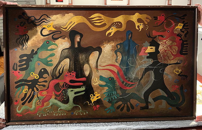 At the FWMA, I examined Julio De Diego’s Fantastic Symphony (Symphonie Fantastique) (1945, figure 2). Like Gropper’s Defiance, this painting was once part of the collection of Philo Farnsworth’s Capehart Corporation, a radio manufacturer. De Diego captures the eerie moodiness of the final movement of Hector Berlioz’s 1830 symphony, where the listener-protagonist becomes encircled and overpowered by ghosts at a nocturnal witches’ sabbath. It is tempting to consider the painting as speaking to the confrontation of evil, as the world conquered the Axis powers. De Diego adapts Berlioz’s piece through strident color and extremely flat paint, making the image stand out sharply on the magazine page. Seeing these paintings in succession afforded me the opportunity to consider their place as décor within the Farnsworth headquarters as well as representative of Associated American Artists, to which both artists belonged, to bring art “from studio to doorstep—wherever you are.”