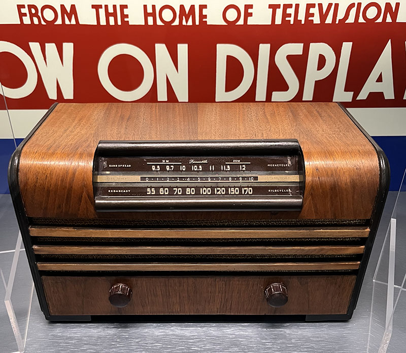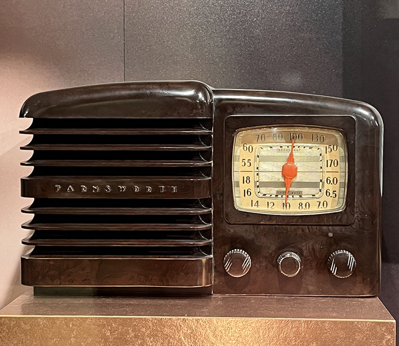Also at the History Center, I perused Farnsworth’s patents for radio parts: tuners, oscillators, and vacuum tubes. The detail these patents described surprised me, as they established how radio designs depended on the material of various internal, metal parts. The patents showed how Farnsworth and his team strove to better the functionality and efficiency of their products. Radio—not merely an aural broadcast—necessitated proper design for both chassis and internal mechanisms. Farnsworth’s radios delivered both, while commissioning art to help sell their products once they became available after the war.